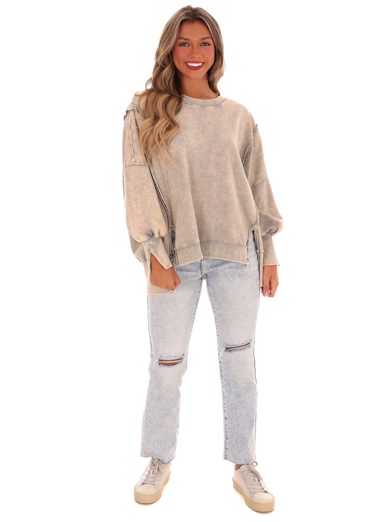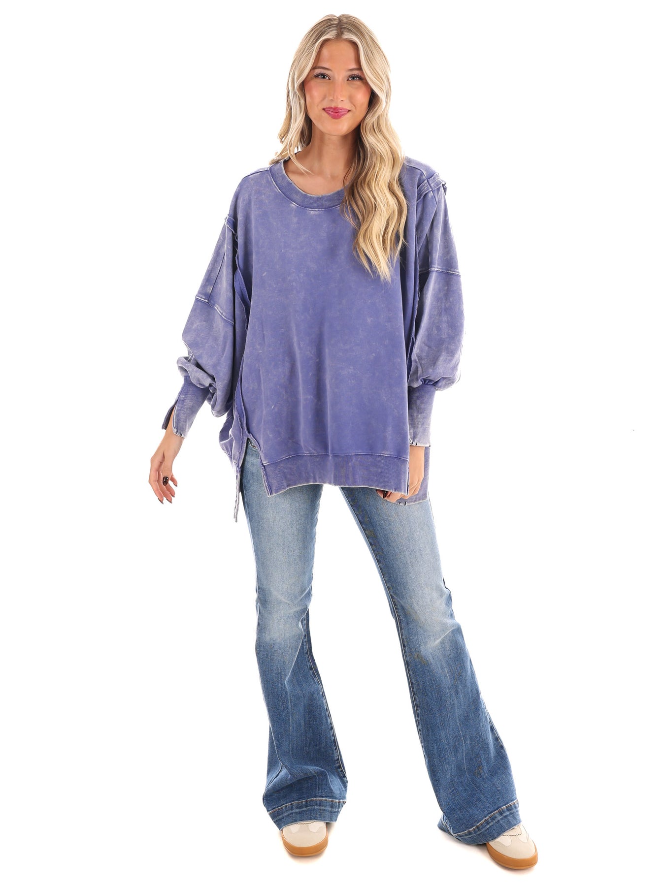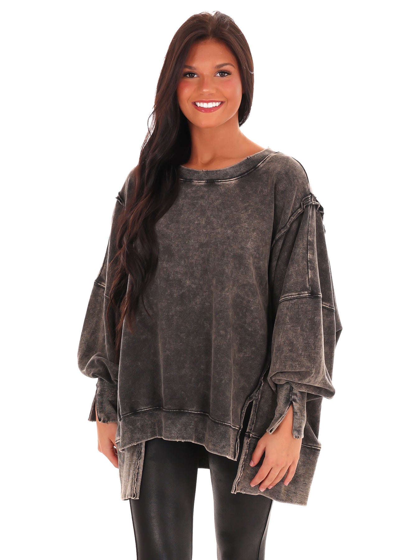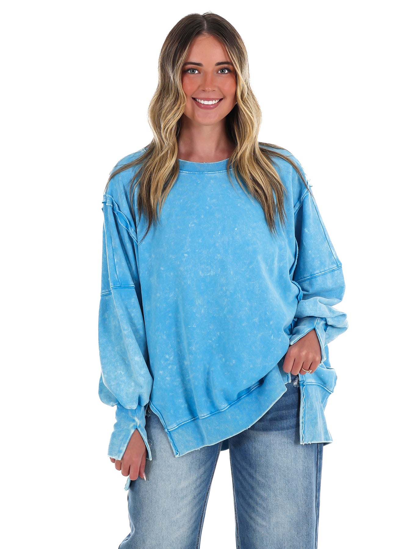 Make a statement with our Lovely Life Acid Wash Sweatshirt! This oversized sweatshirt features acid wash French terry fabric and exposed seam details for a unique and edgy look. With a hi-low hem, this sweatshirt is both stylish and comfortable. Make your life lovelier with this must-have piece.