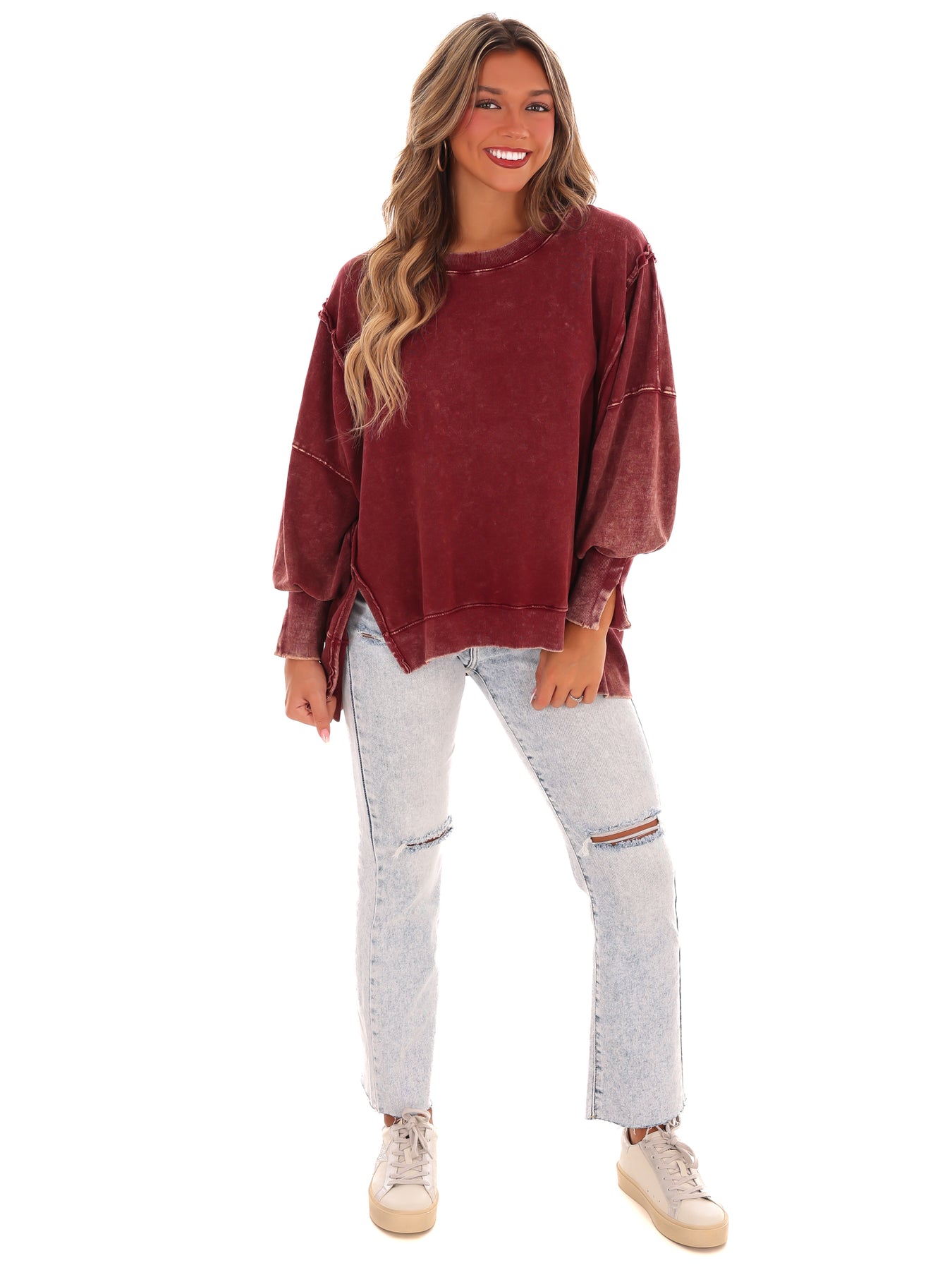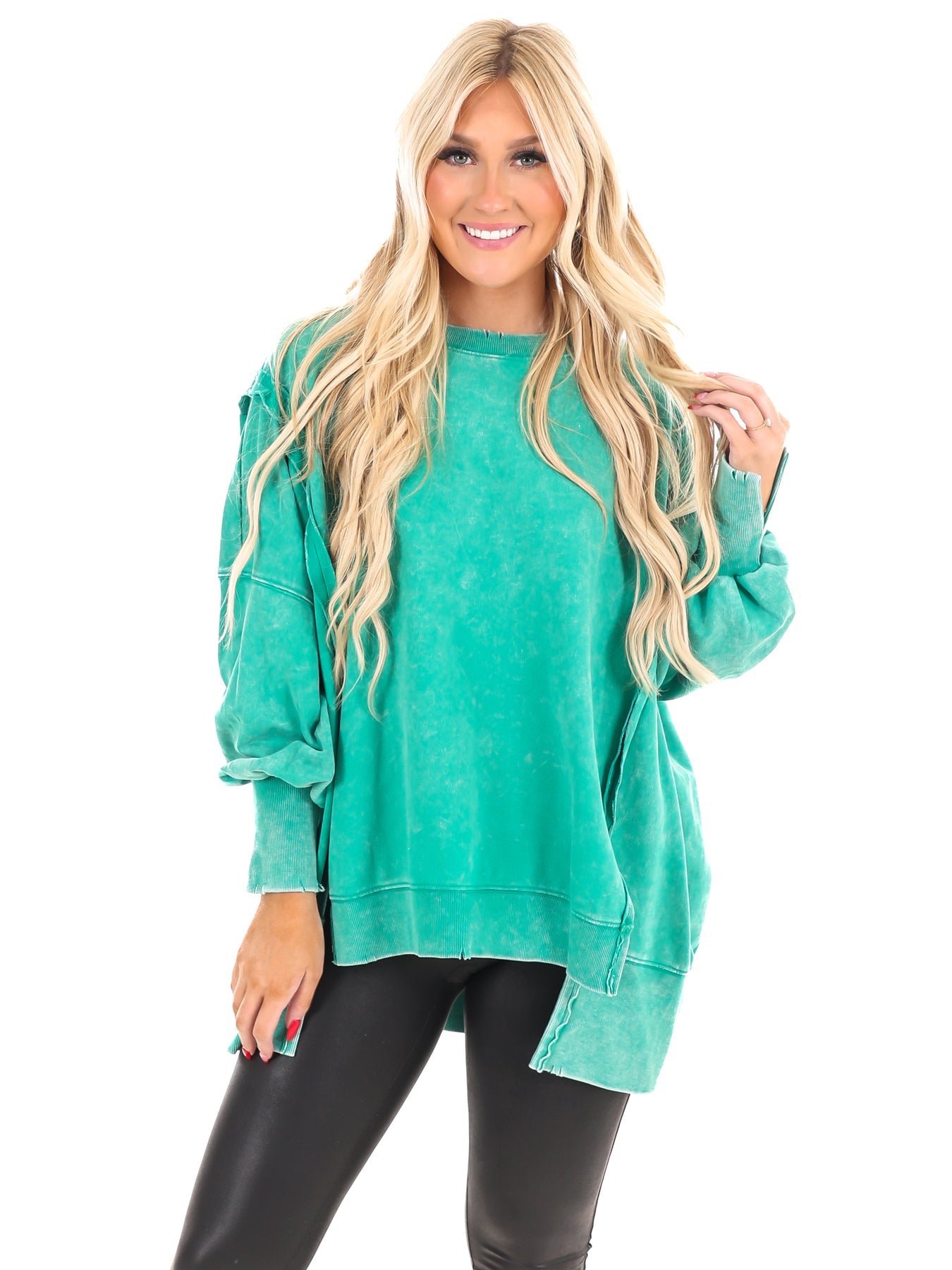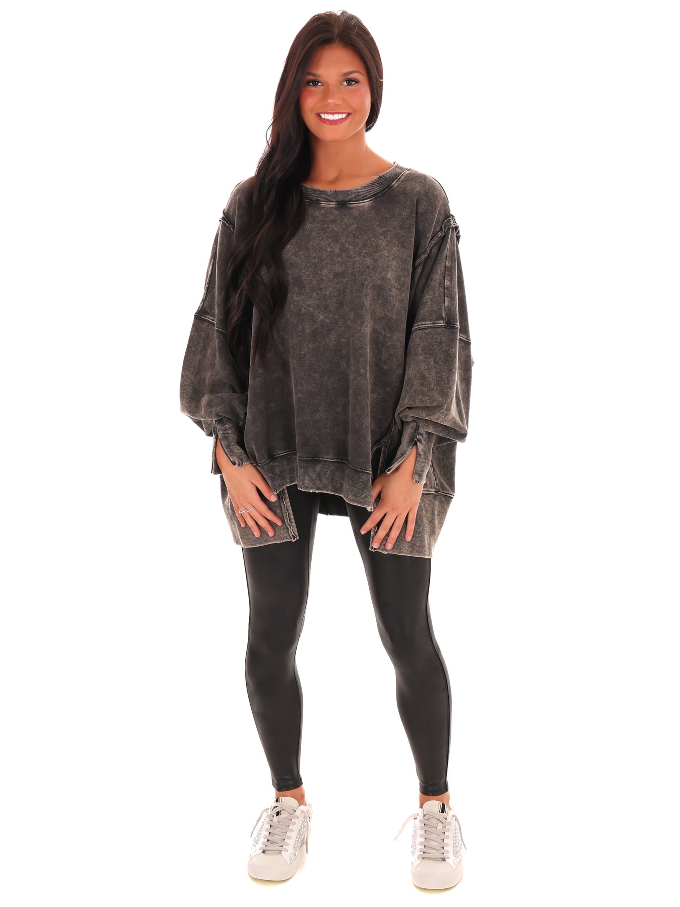 Make a statement with our Lovely Life Acid Wash Sweatshirt! This oversized sweatshirt features acid wash French terry fabric and exposed seam details for a unique and edgy look. With a hi-low hem, this sweatshirt is both stylish and comfortable. Make your life lovelier with this must-have piece.