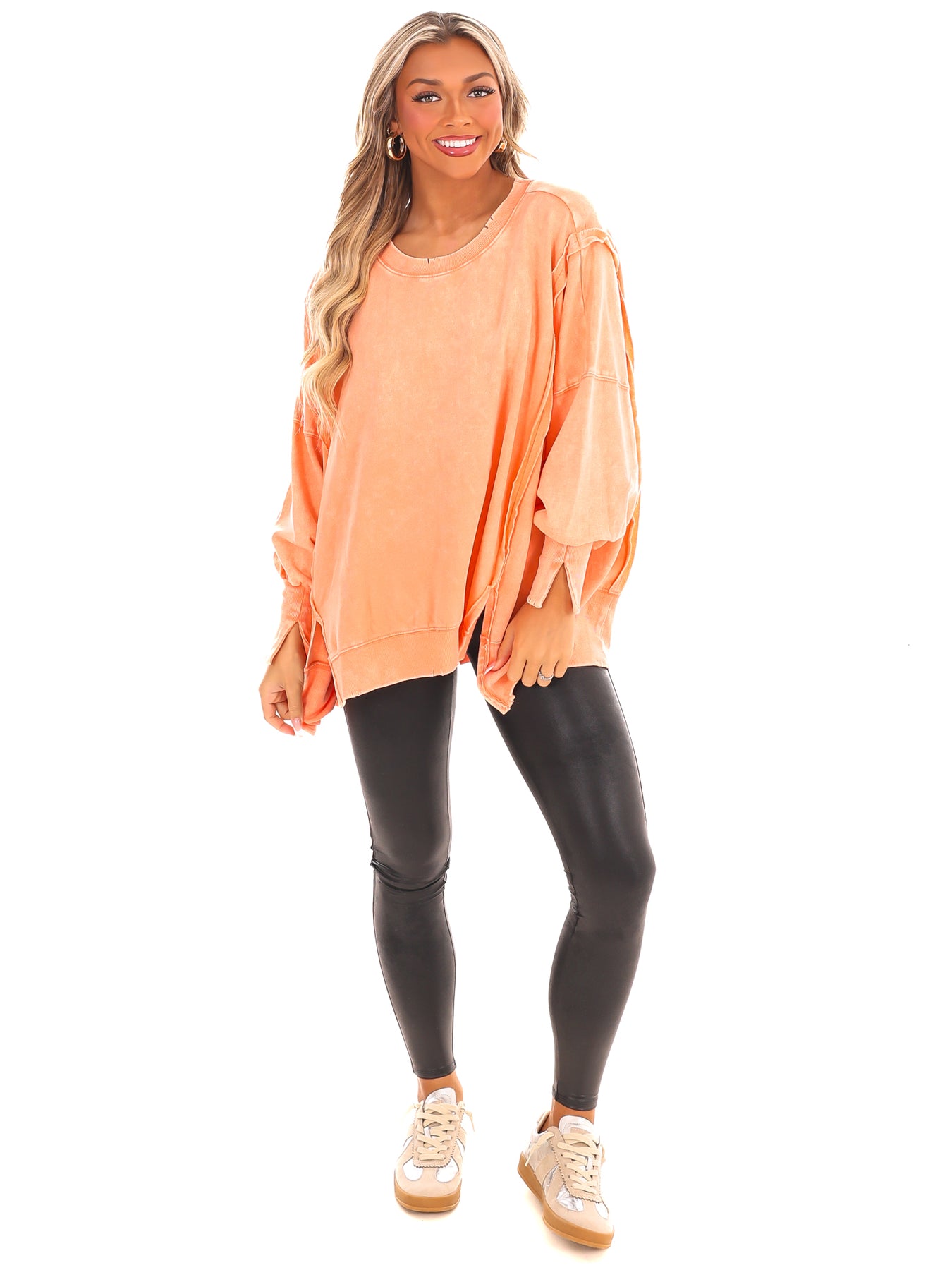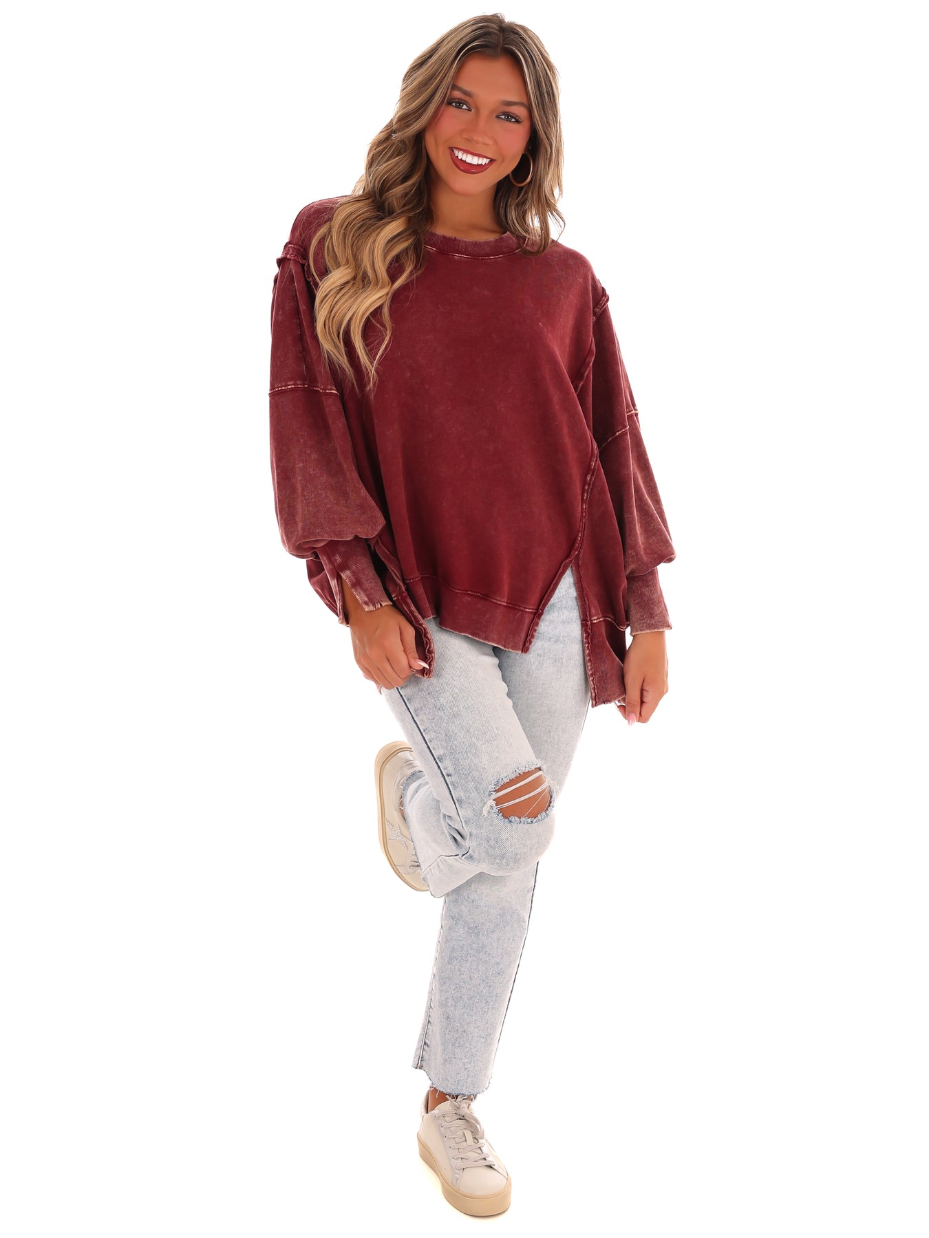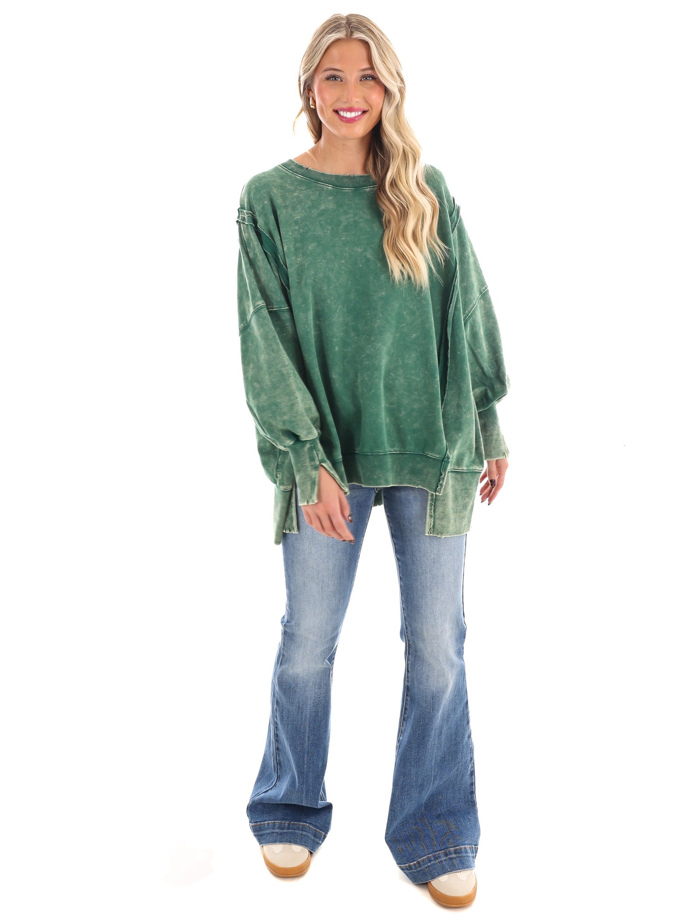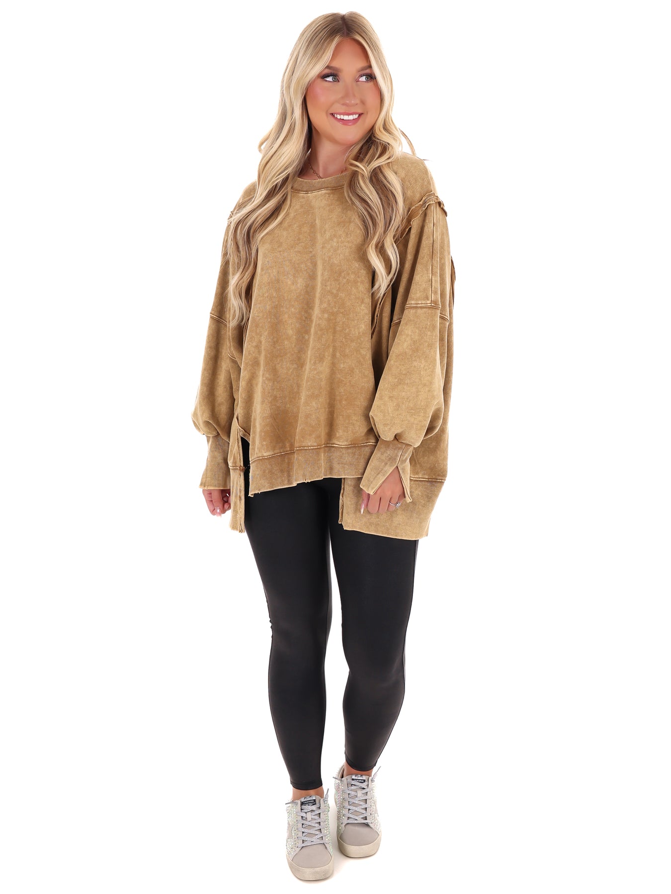 Make a statement with our Lovely Life Acid Wash Sweatshirt! This oversized sweatshirt features acid wash French terry fabric and exposed seam details for a unique and edgy look. With a hi-low hem, this sweatshirt is both stylish and comfortable. Make your life lovelier with this must-have piece.