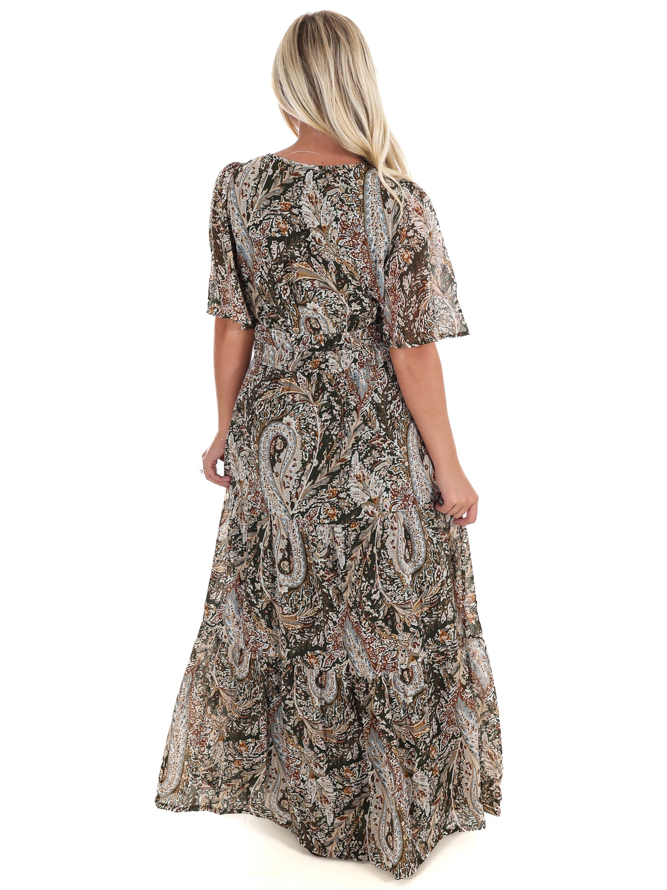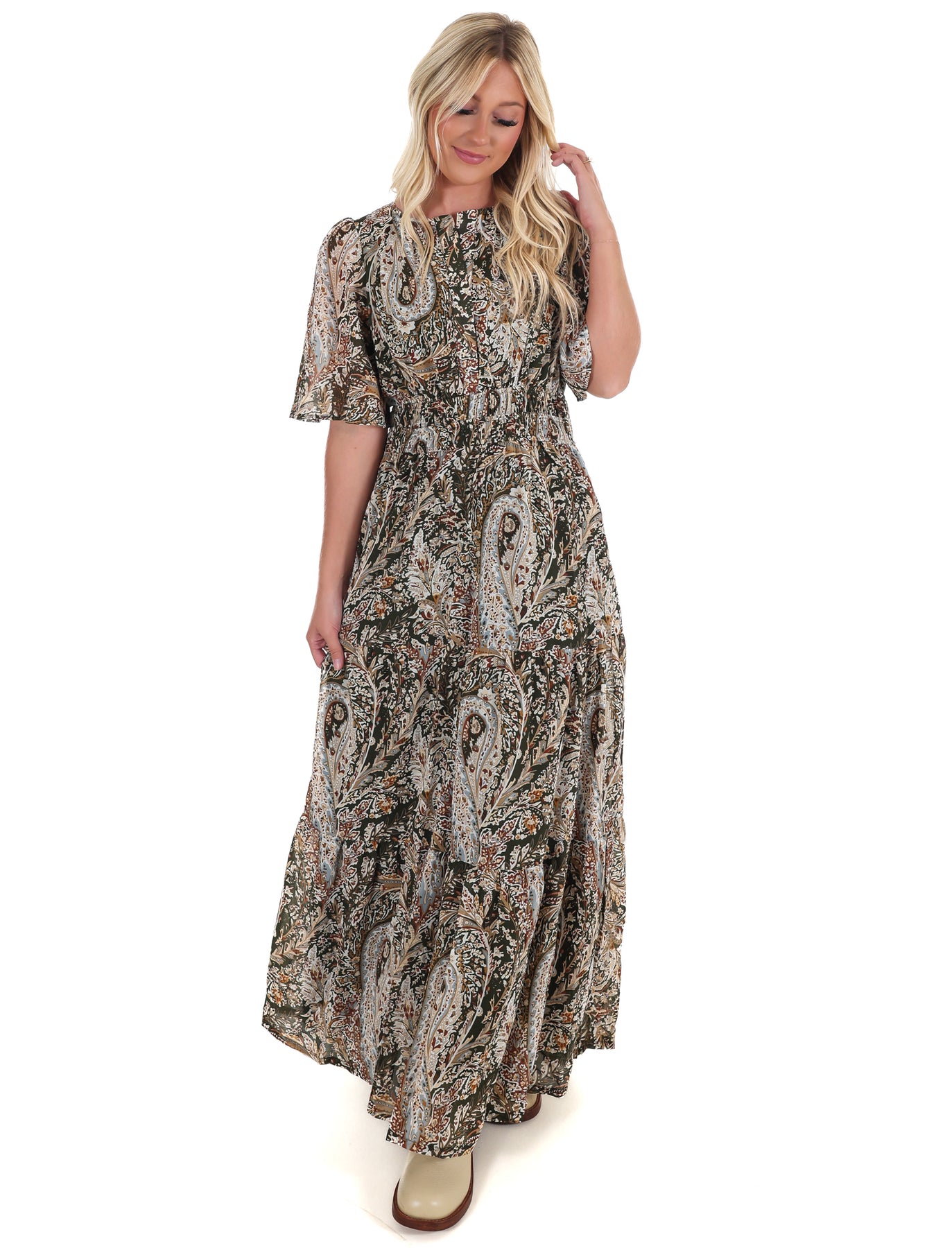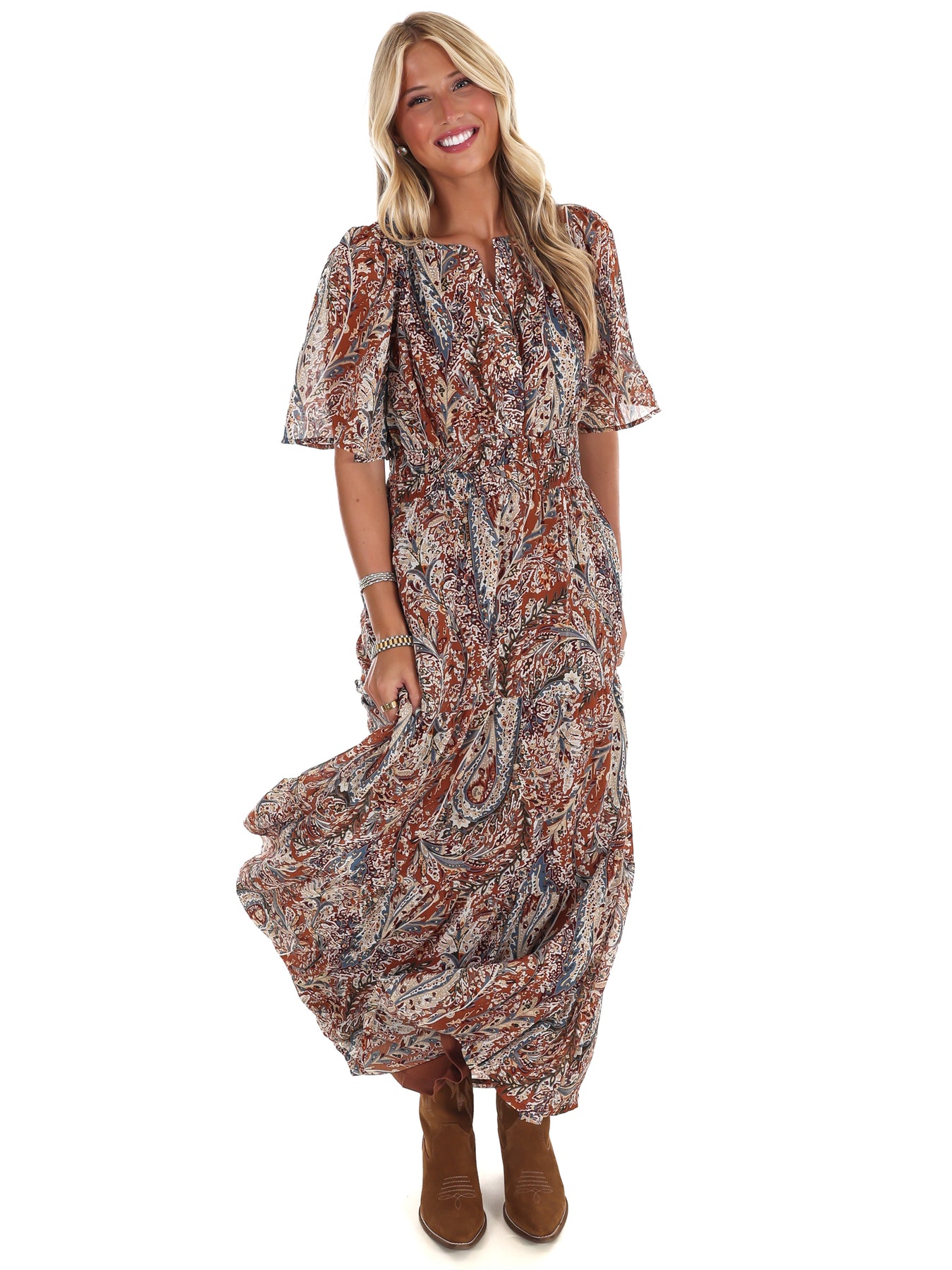 Embrace effortless elegance with the Autumn Air Maxi Dress. Featuring half flutter sleeves and a flowing tiered silhouette, this woven dress offers both comfort and style. Fully lined and designed with convenient pockets, it seamlessly blends practicality with grace—perfect for day-to-night wear. Let its flattering fit and charming print elevate your wardrobe with ease.