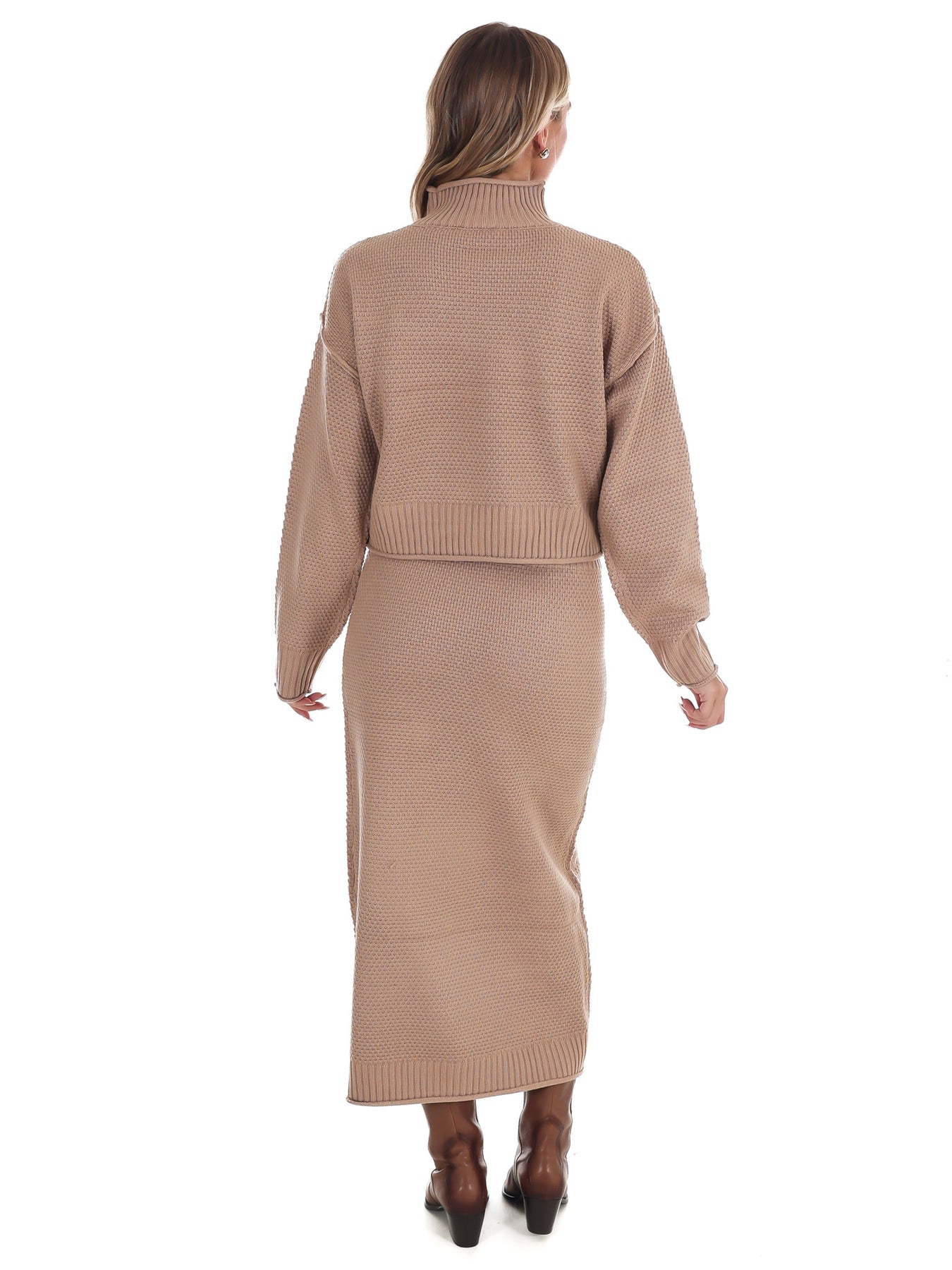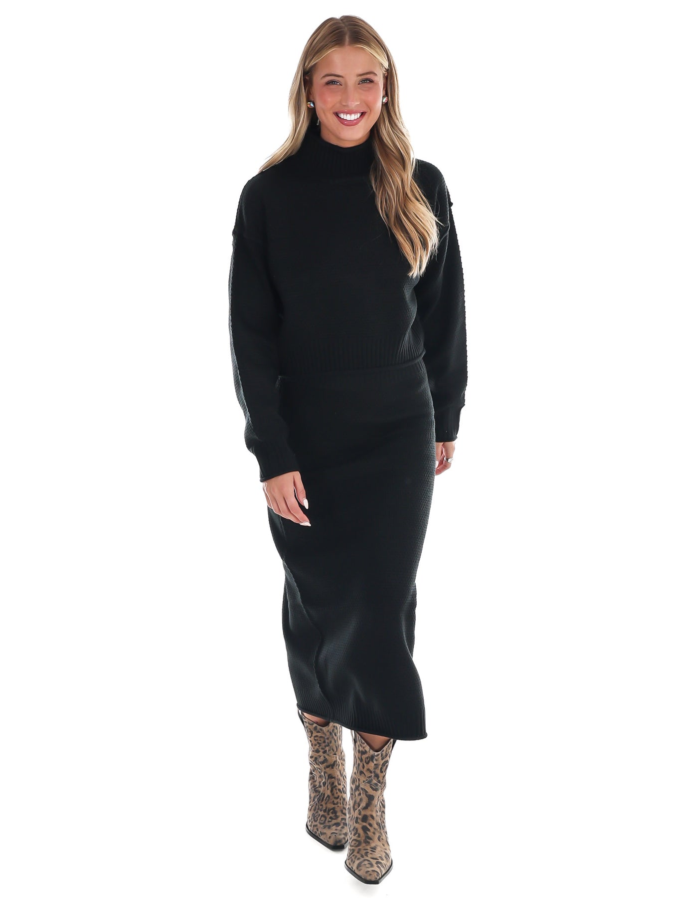 This Chalet Sweater Skirt Set combines a textured high neck sweater with a matching long skirt for effortless comfort and style. Its relaxed fit makes layering easy, keeping you cozy on cooler days while maintaining a polished appearance. Perfect for casual evenings or workdays, this versatile set pairs beautifully with simple jewelry and loafers, transitioning seamlessly from the office to weekend outings. Enjoy both ease and elegance in one coordinated look.