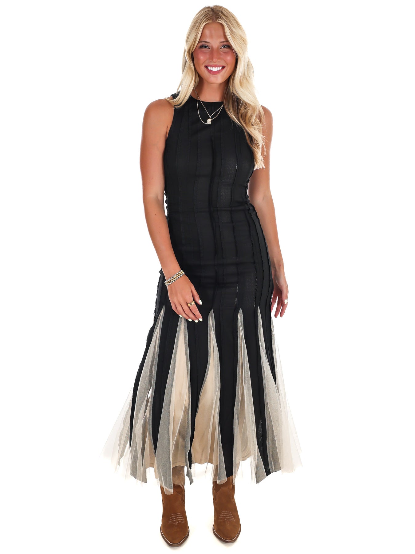 Step into effortless charm with the Seraphina Tulle Maxi Dress. This playful solid knit dress features a flattering round neckline and sleeveless design, perfect for warm days or layering. The delicate tulle inset at the bottom adds a whimsical touch, while the back zipper closure ensures a comfortable fit. Ideal for twirling through any occasion with grace and fun.