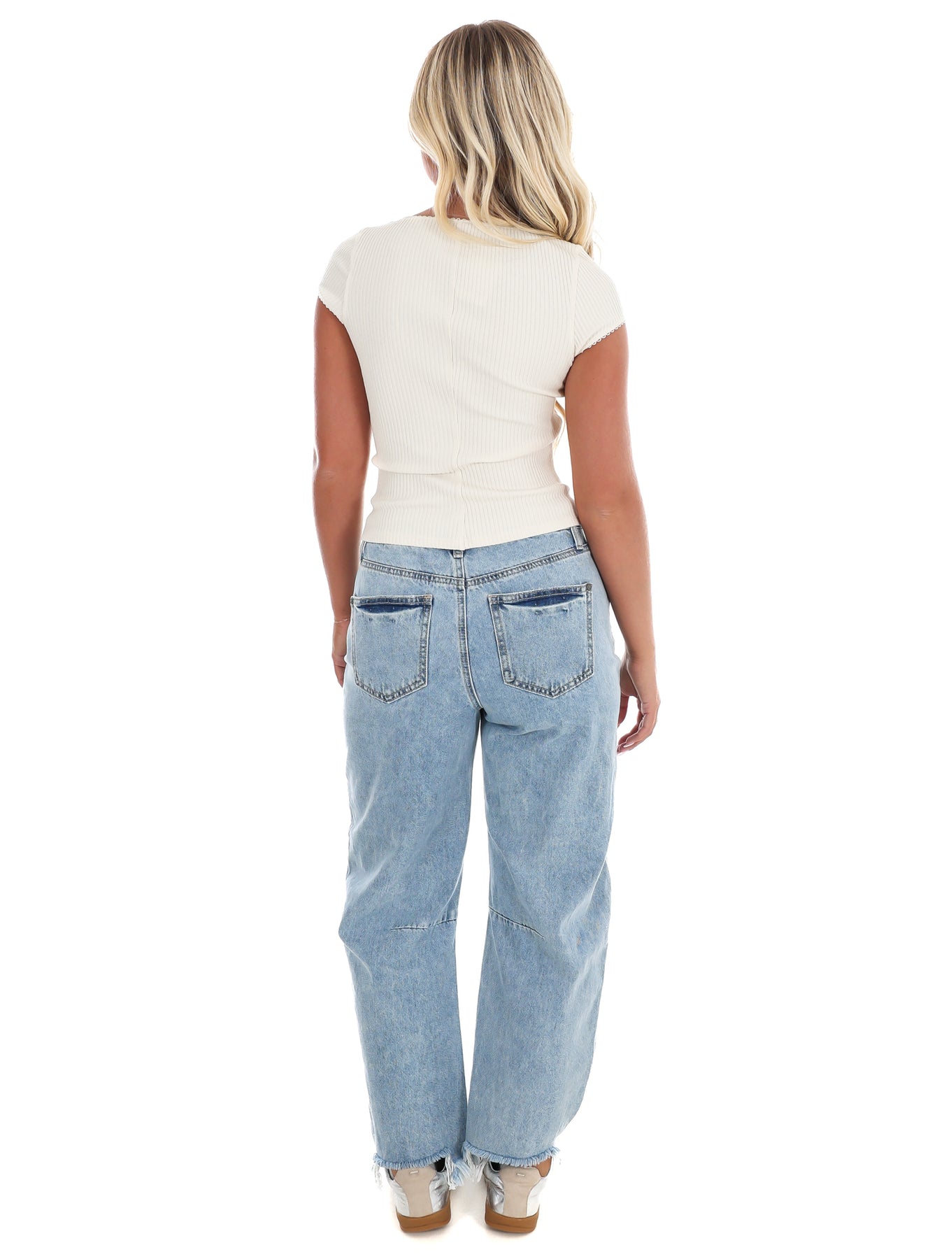 Features: Ribbed swit fabrication, crew neckline, button-front closure, capped sleeves, picot trim