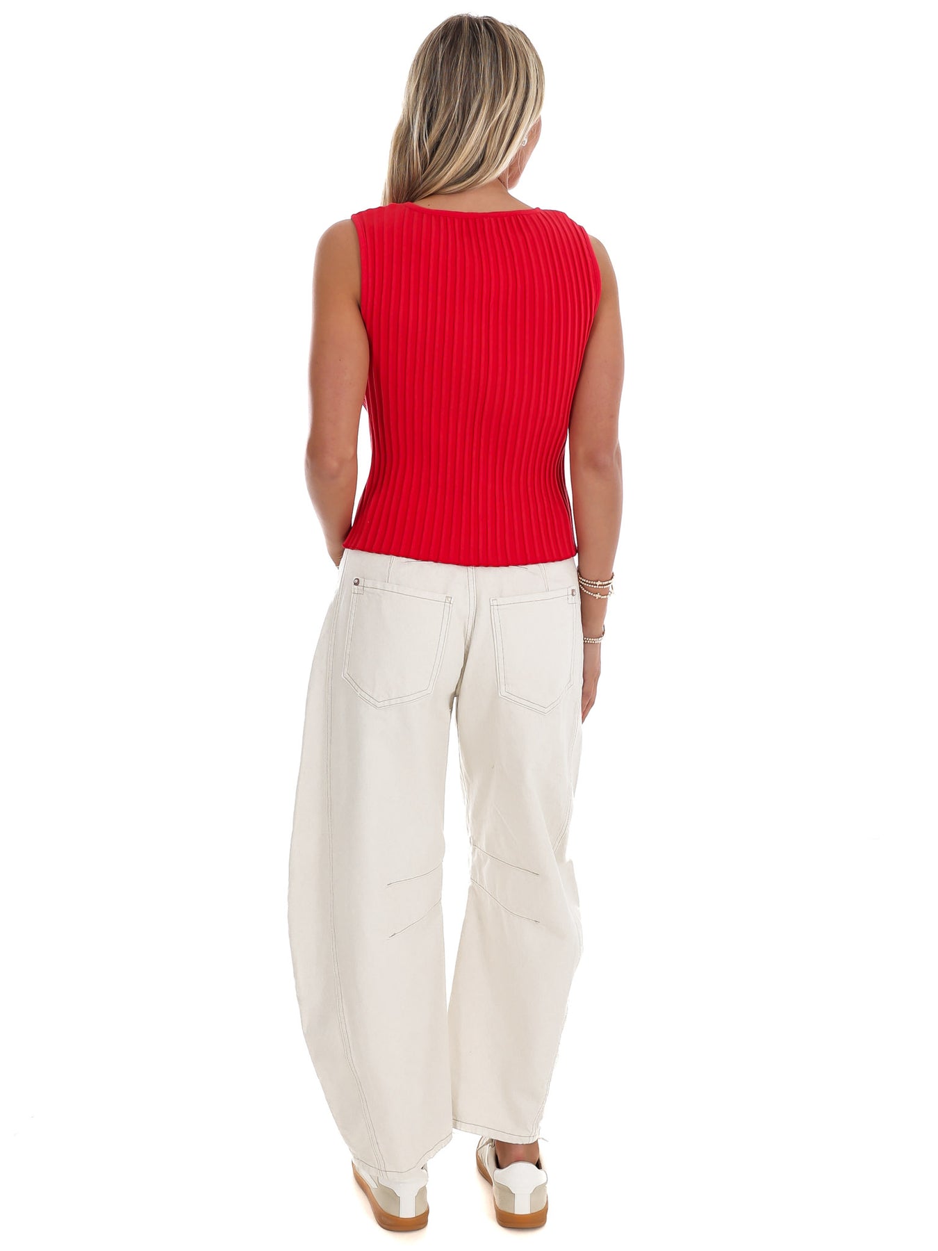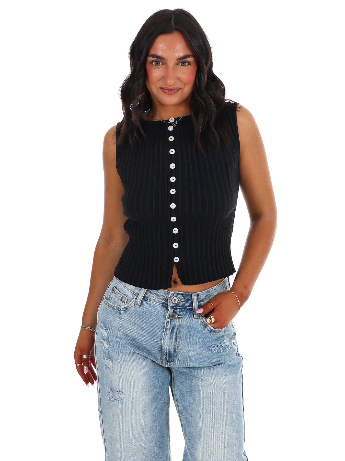 Simple yet chic, this timeless top is featured in a ribbed knit fabrication and slim-fitting silhouette with a scoop-neckline and button-front closures.