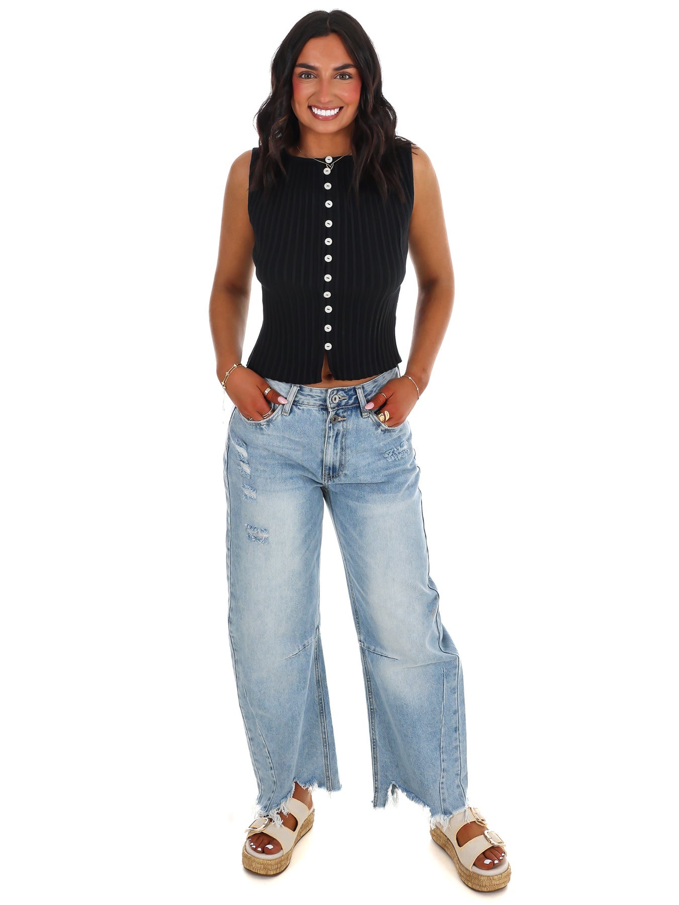Features: Ribbed knit fabrication with a stretchy feel, scoop-neckline, button-front closures