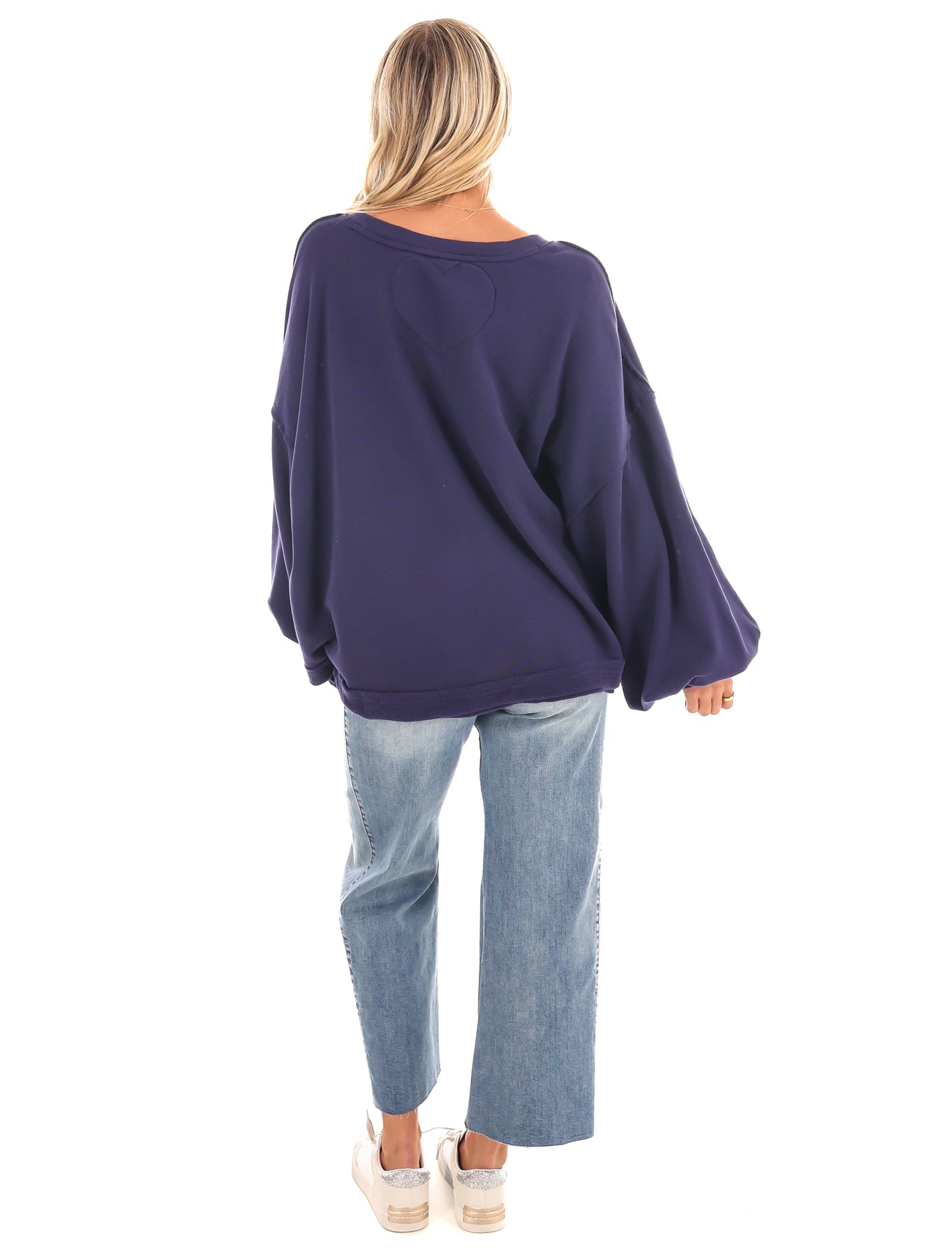 Features: Soft cotton fabrication, scoop neckline, drop-shoulder sleeves with ribbed knit cuffs, raw hemlines, exposed seams, heart detail at back