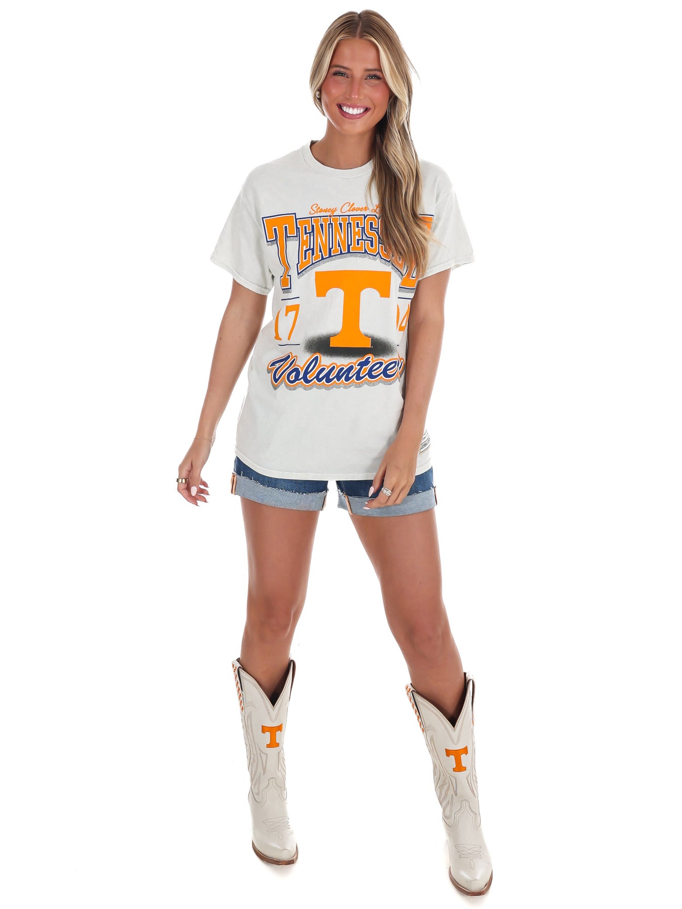 Show off your Tennessee spirit with the '47 x Stoney Clover Lane Tennessee Glitter Spirit Vintage Tee. Featuring glitter details and a vintage-inspired design, this tee offers both style and comfort. Perfect for fans looking to add a standout piece to their casual wardrobe, it brings a sparkling touch to your game day or everyday look.
