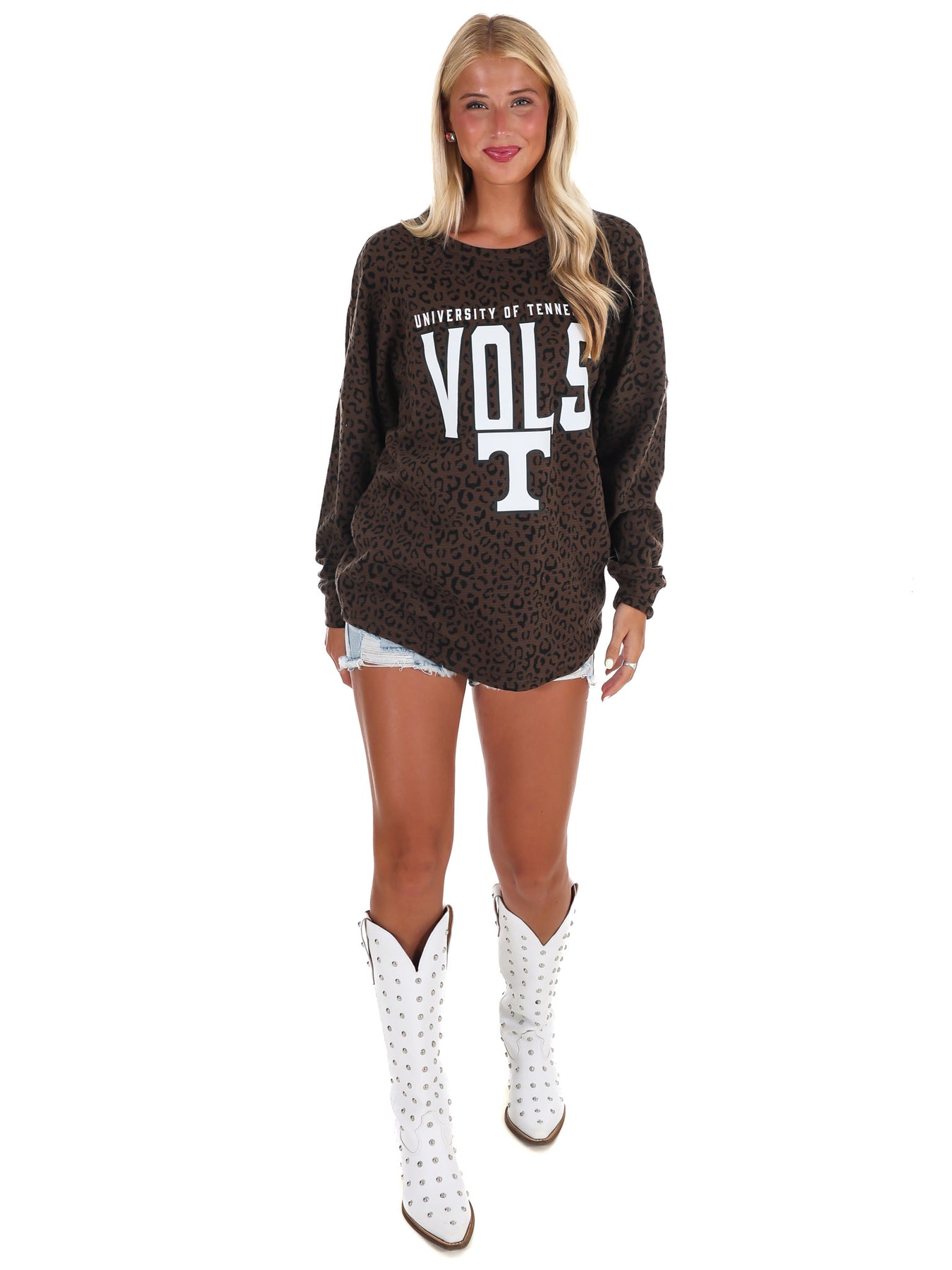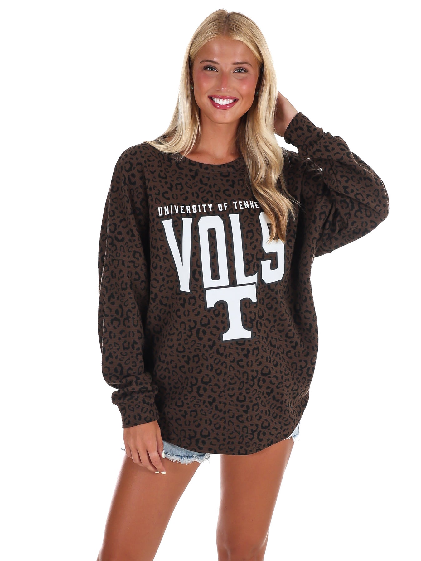 This all over leopard-print pullover brings serious attitude to your fanwear rotation. Made from vintage-washed corded fabric with a relaxed fit and drop-shoulder silhouette, it’s cozy, cool, and designed to stand out. Featuring bold Tennessee Volunteers graphics, it's the perfect layer for elevated everyday spirit.