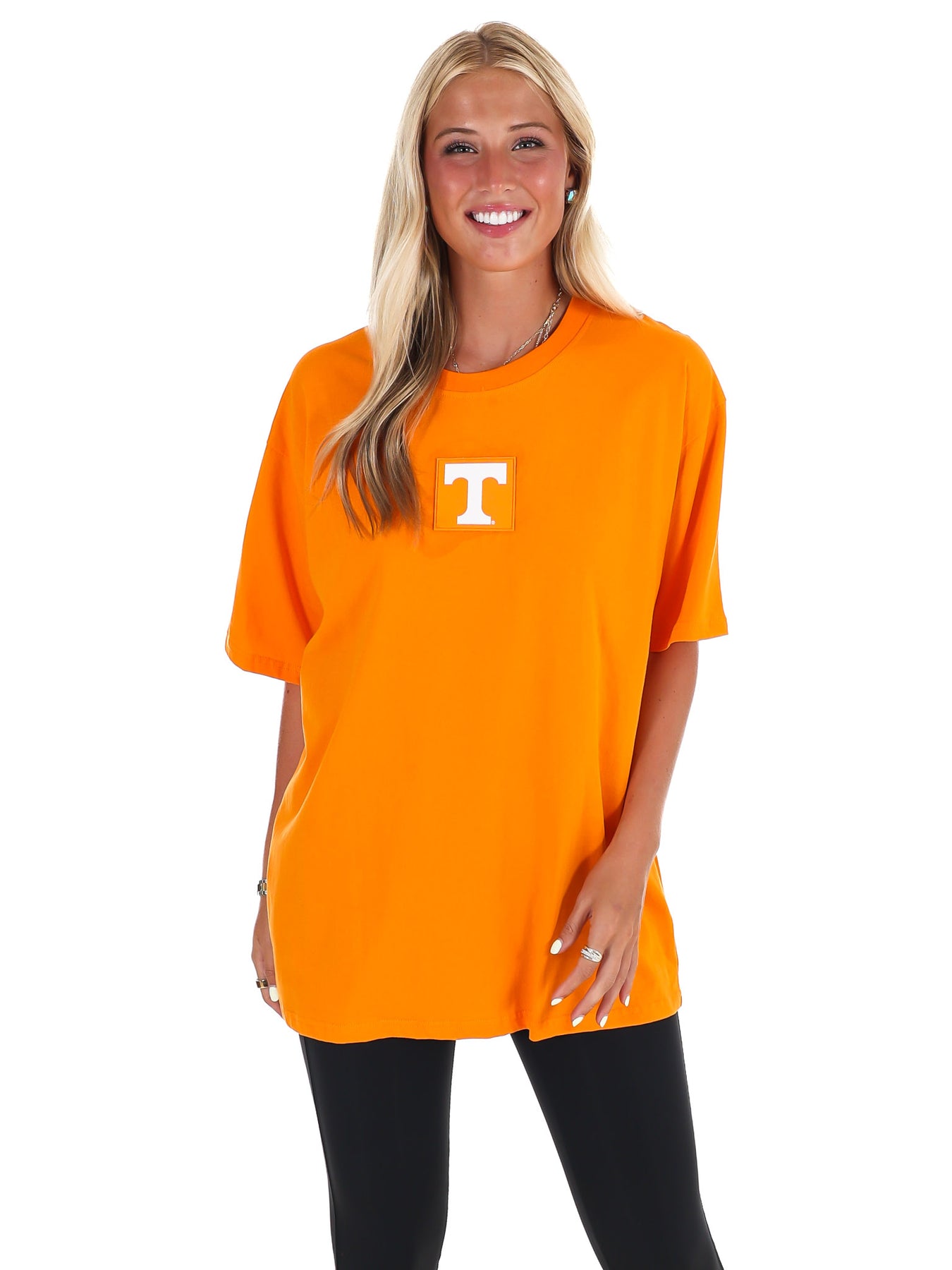 Show your Vols pride in style with this vibrant orange oversized tee, featuring a bold power “T” on the front and “Tennessee Go Vols” cheerfully printed on the back. Perfect for game days, its curved hem and relaxed boyfriend fit keep you comfy while you root for your team with flair.