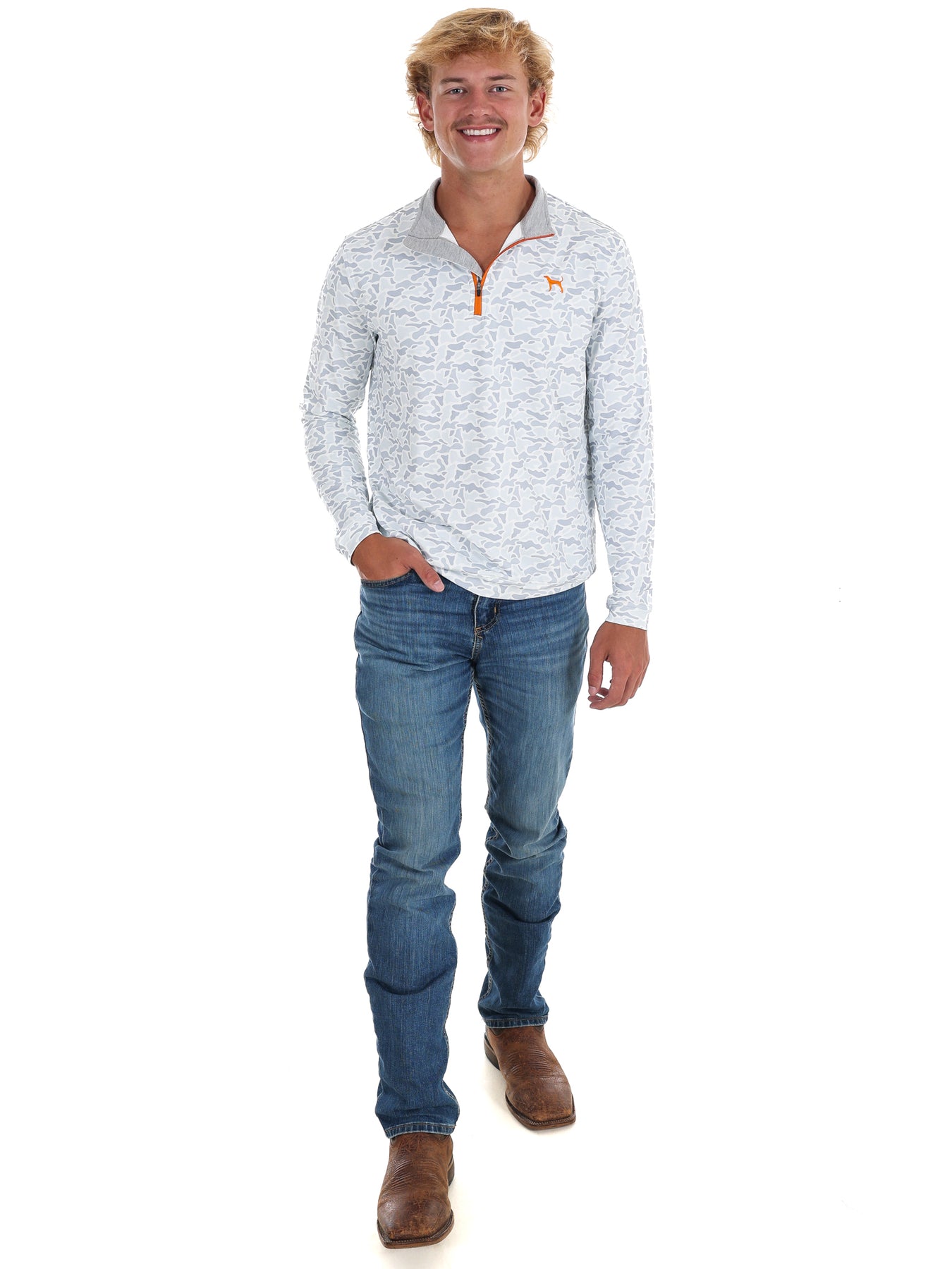 Crafted with precision, the Men's Grey Camo 1/4 Zip Pullover features a distinctive grey camouflage pattern paired with a vibrant orange zipper and an expertly embroidered orange hound dog emblem. This piece from the gameday collection offers a polished, functional design that ensures comfortable layering and subtle team spirit for the discerning sports enthusiast.