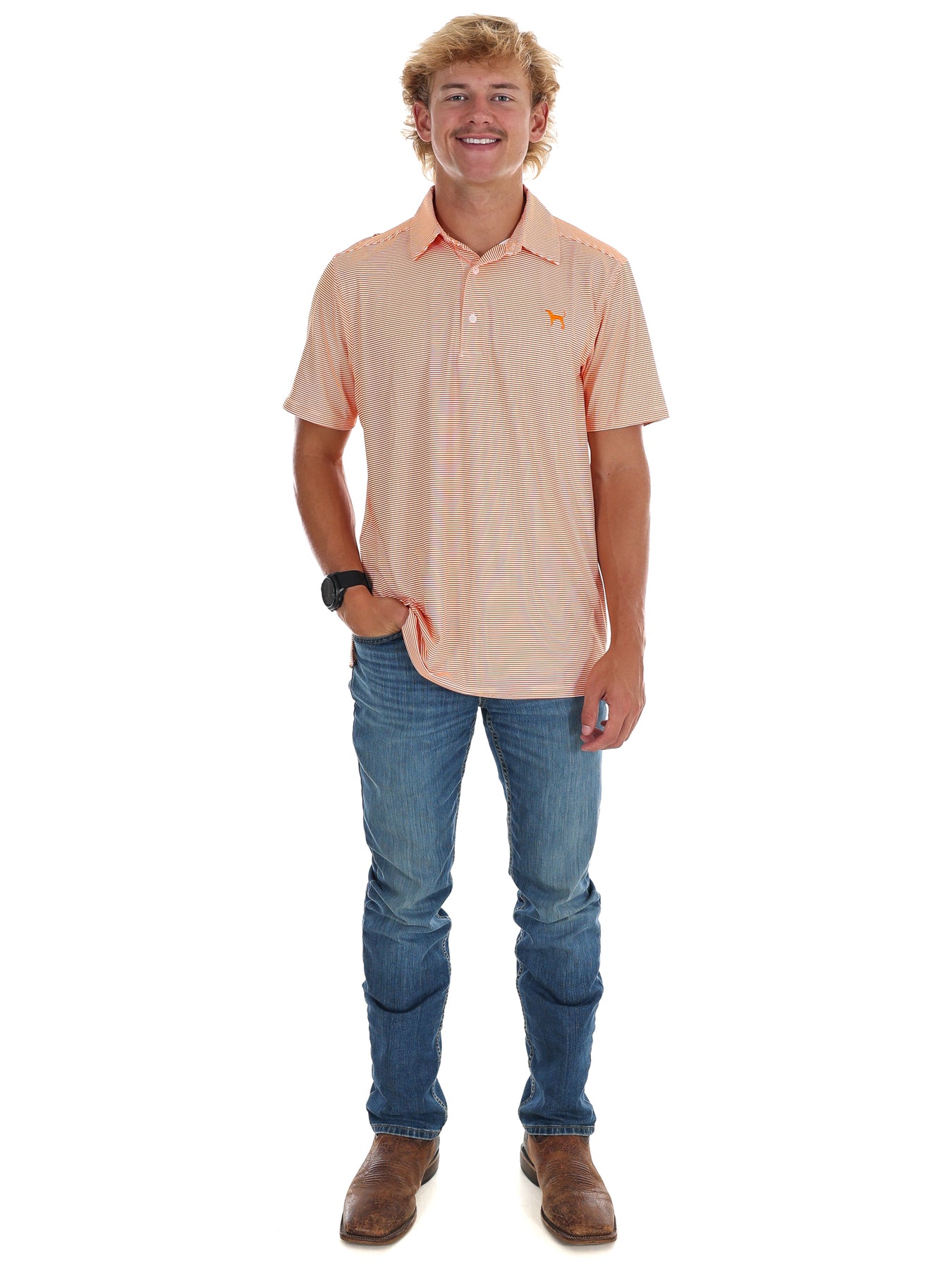 Show your team pride with the Men's Stripe Hound Dog Polo, featuring striking orange and white stripes and an embroidered orange hound dog emblem. Designed for comfort and lasting wear, this polo is perfect for gameday or casual occasions, combining classic style with subtle, expert detailing.