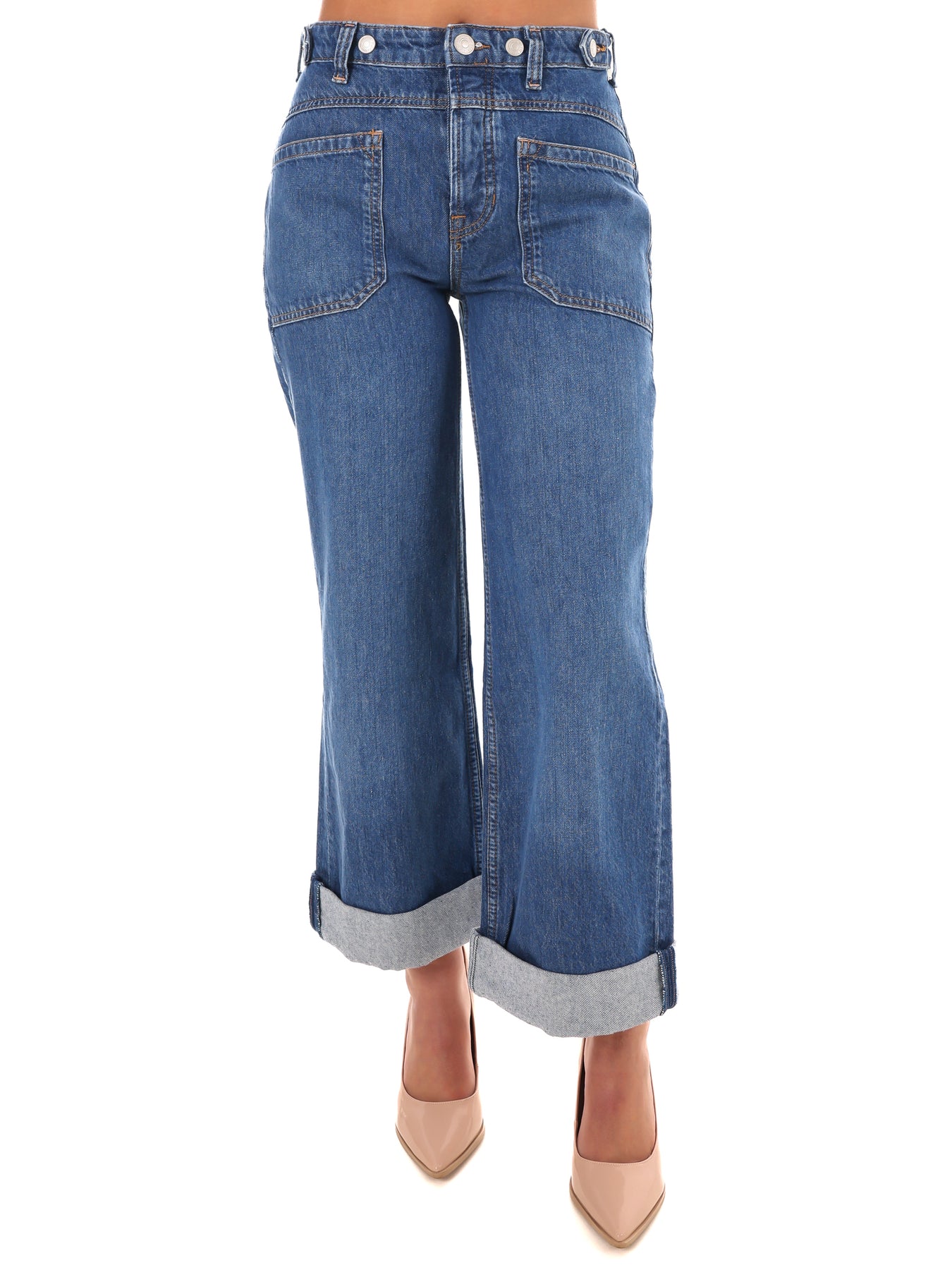 Features: Zip fly and button closure, seamed pouch pockets, yoking for added shape, button detailing at the waistband, cuffed hemlines