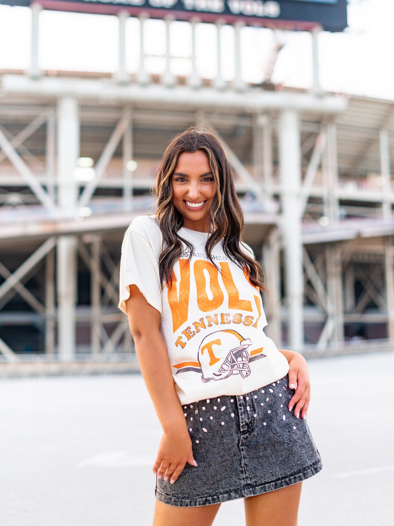 Get ready to show off your team spirit with the Vols Established Date Helmet Thrifted Tee! This unique tee features a vintage helmet design and the established date of your favorite team. Perfect for game day or everyday wear, this tee is a must-have for any die-hard fan. (Go Vols!)