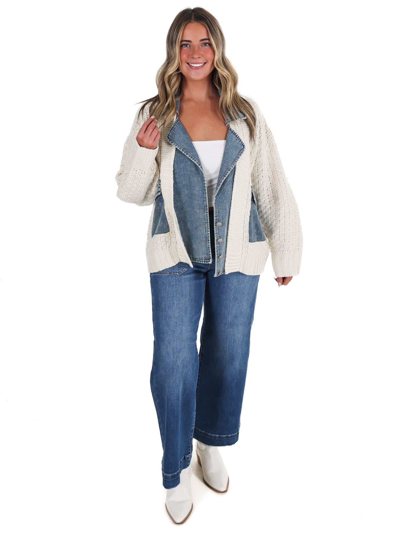 This Mixed Media Cable Knit Denim Trim Jacket combines cozy comfort with stylish details. Featuring a collared notch collar, long sleeves, and button-down front, it offers easy layering for cooler days. Practical pocket details and a unique cable knit pattern enhance its charm, while denim trim adds a contemporary touch. Perfect for adding warmth and texture to your wardrobe with confidence.