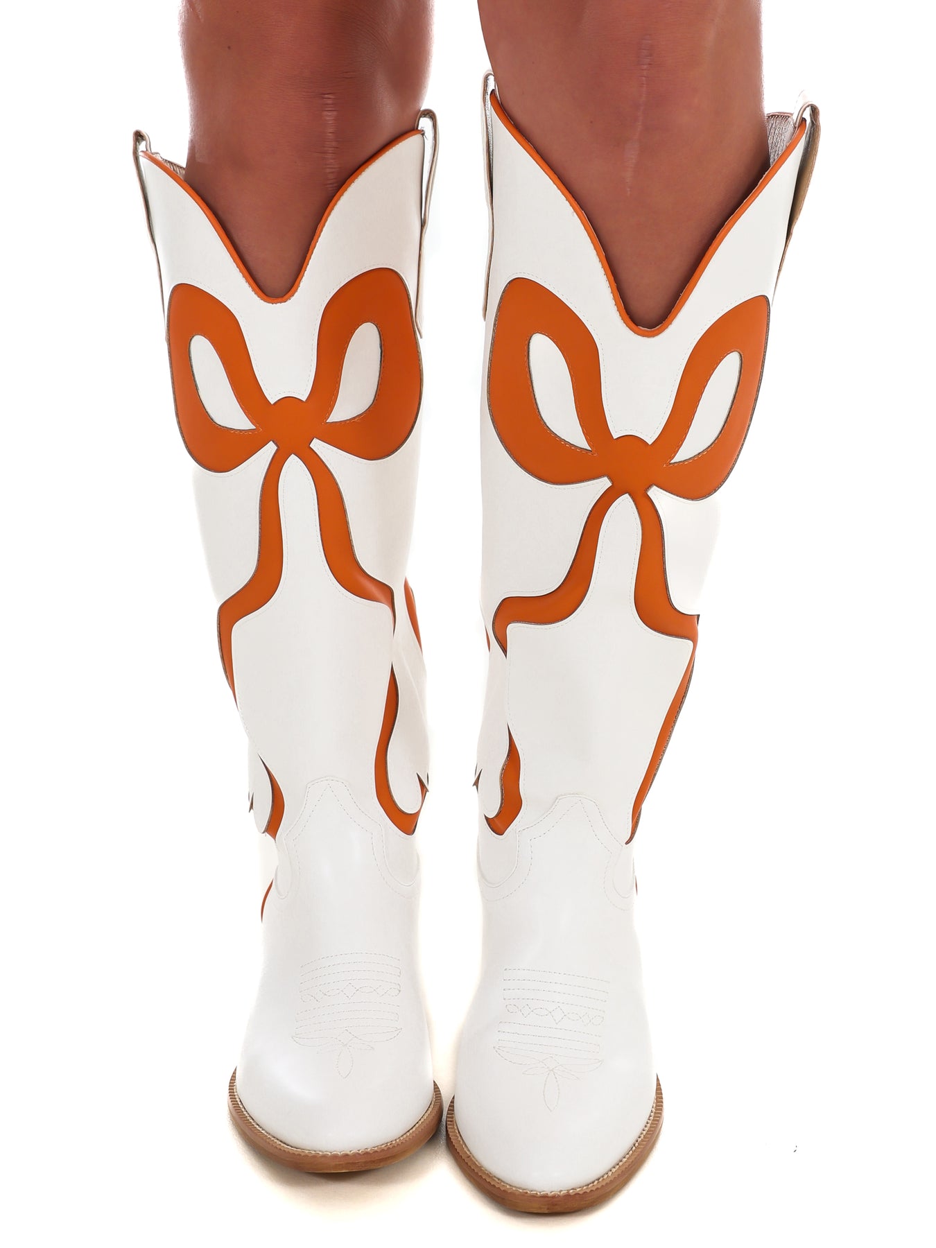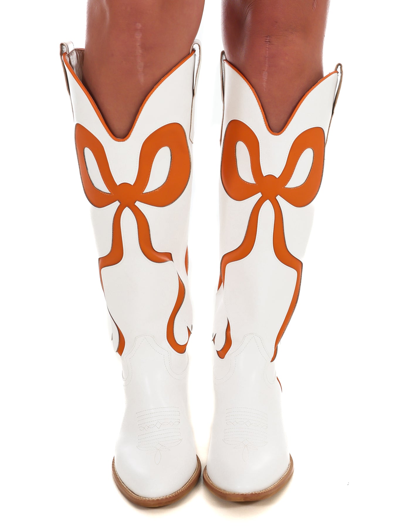 Step into style and spirit with the Gameday Bow Boots. These striking white cowboy boots feature vibrant orange "cut out" bows on both the front and back, adding a playful yet bold touch to your look. Perfect for showing off your team pride or making a standout statement, they combine classic western flair with a fresh, eye-catching design. Comfortable and confident, these boots are ready to elevate your game day outfit and beyond.