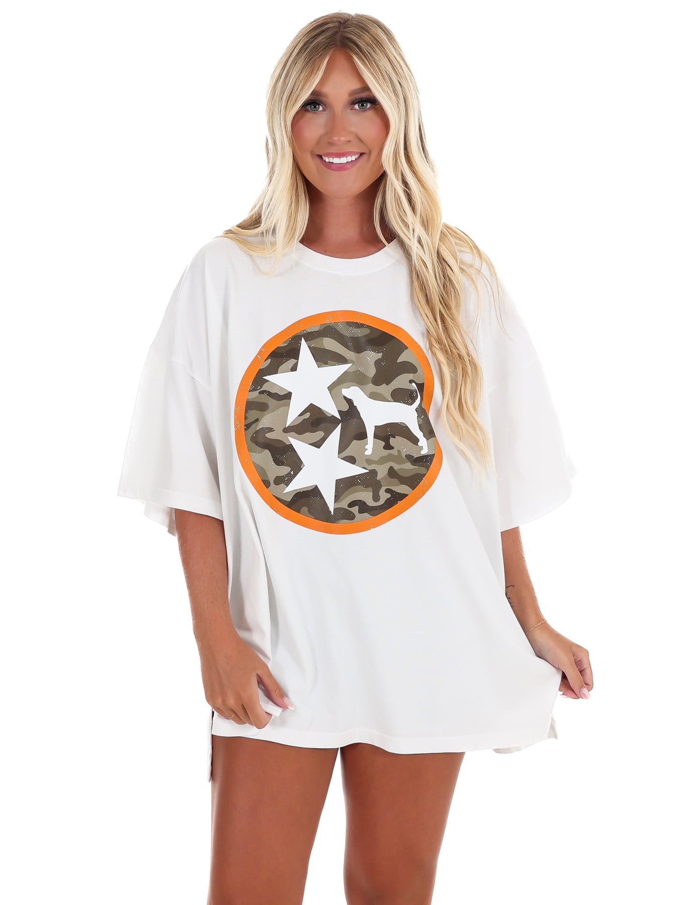 Get ready for game day with this oversized, one-size-fits-all tee featuring a fun camo hound dog tri-star design. Exclusively from Josie's Boutique, this unique tee combines comfort and style for a playful look that stands out in the crowd. Whether you're cheering from the sidelines or relaxing with friends, this tee keeps your game day vibe effortlessly cool and one of a kind.