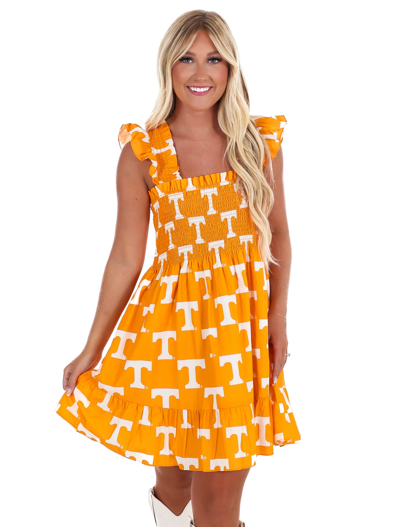 Show your Volunteer spirit in style with this playful dress featuring bright orange fabric covered in white power T's. The smocked bodice adds a flattering, stretchy fit while crisp poplin sleeves bring breezy comfort. Perfect for game day or any spirited occasion, this dress combines team pride with easy, flirty fashion.