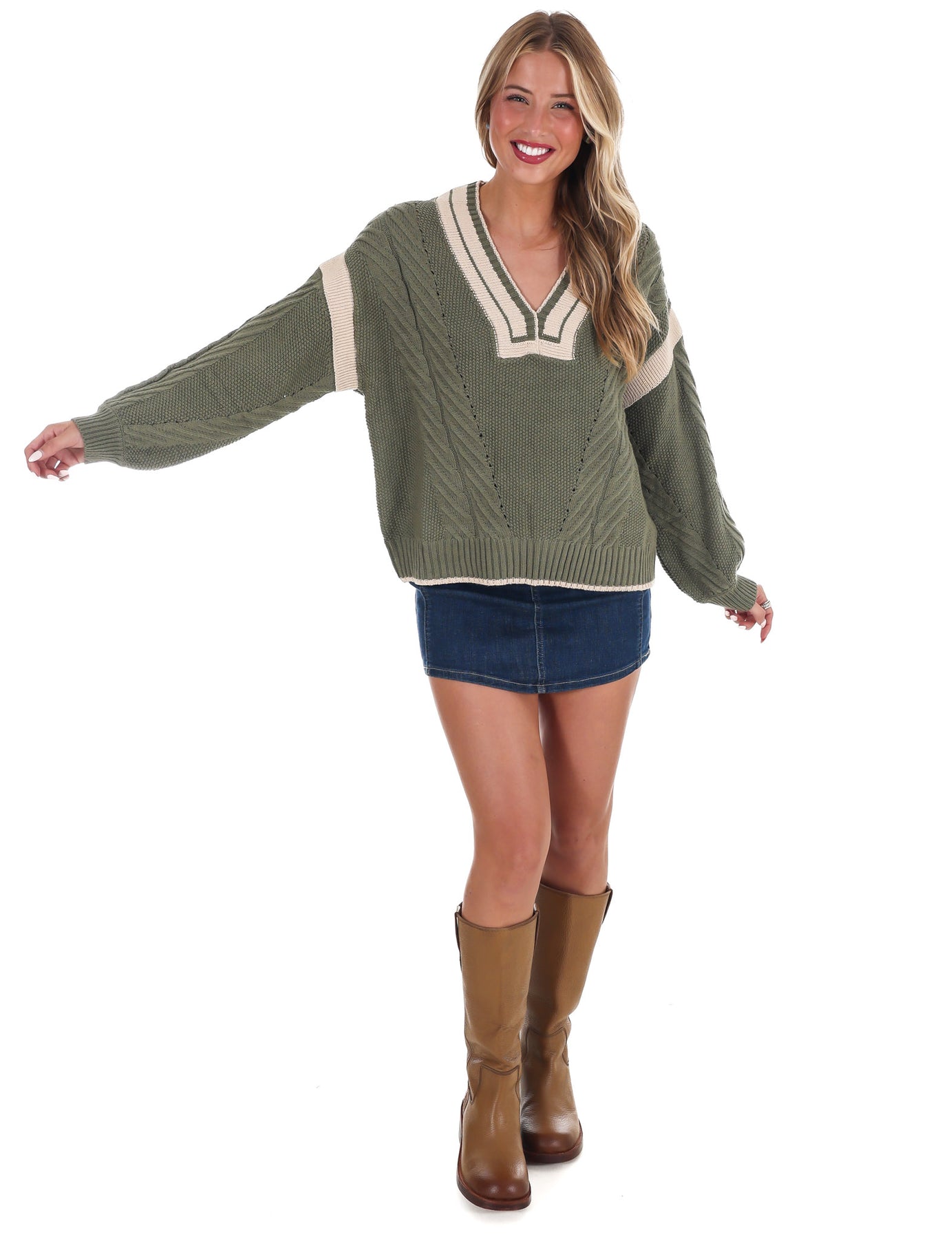 Stay cozy and stylish with the Crisp Air V-Neck Cable Knit Sweater. This long sleeve pullover features a classic cable knit pattern and a flattering v-neckline, enhanced by thoughtful contrast detailing for added visual interest. Perfect for layering or wearing on its own, this sweater offers both comfort and a polished look, helping you feel confident and warm throughout your day.