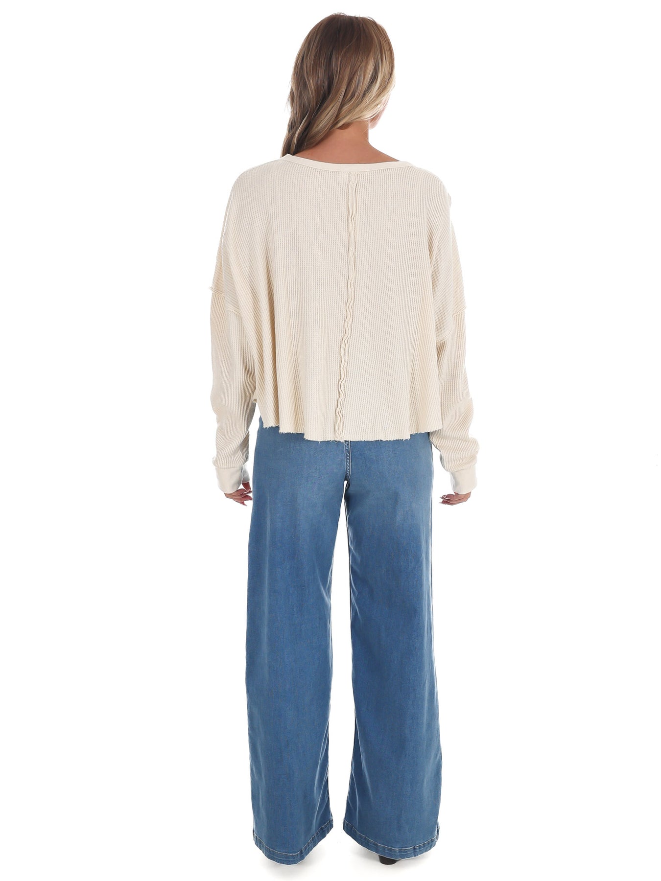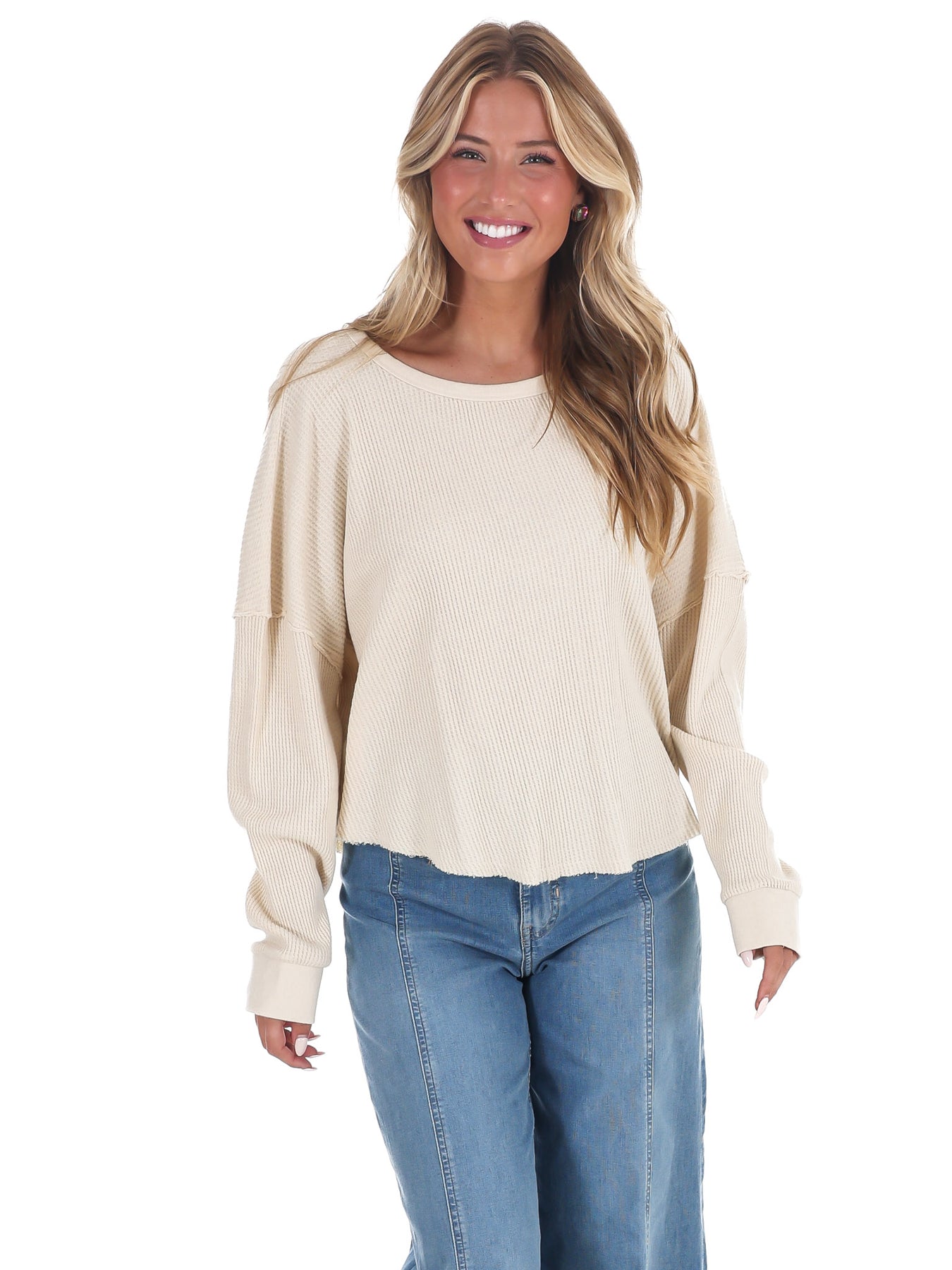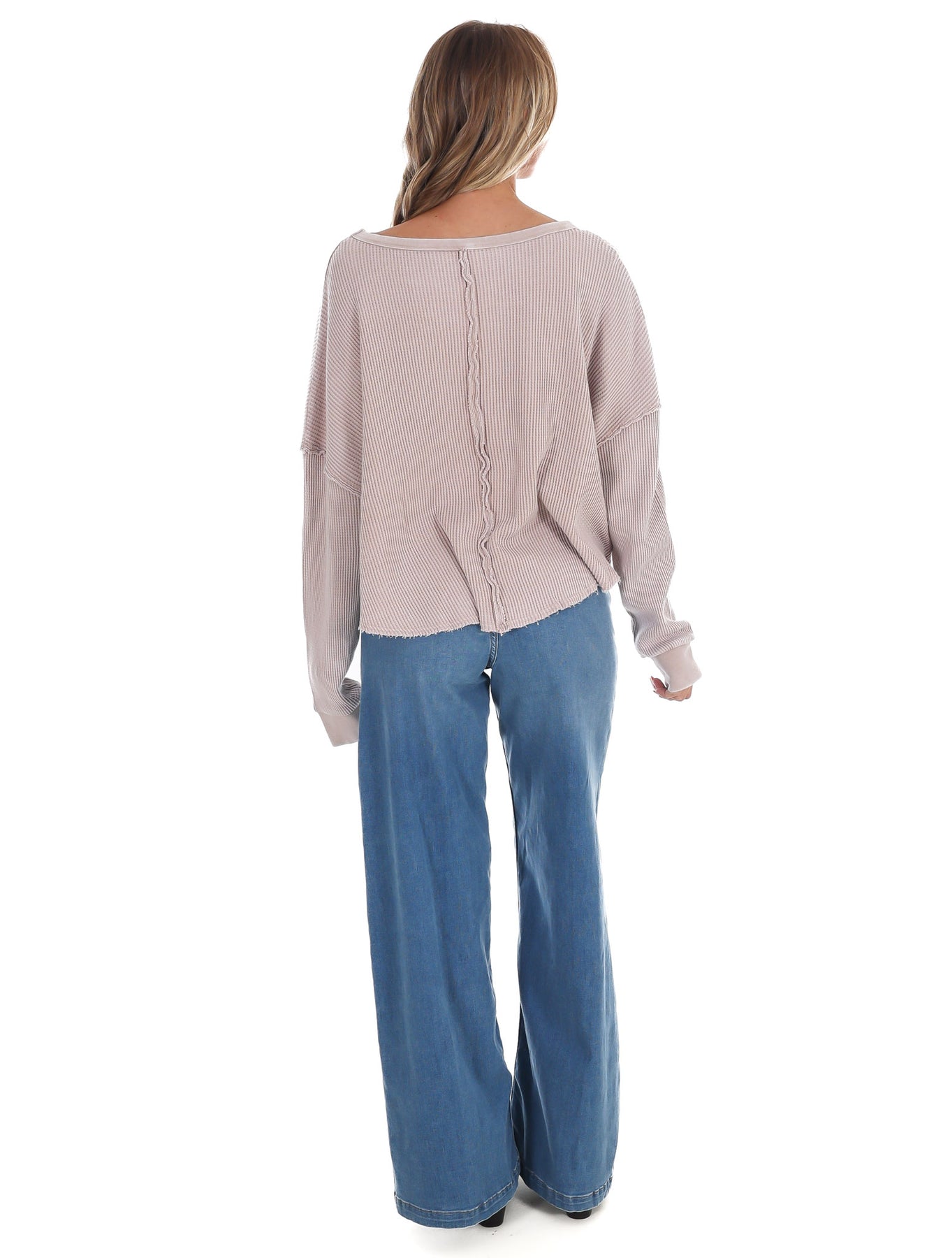 The Mineral Mist Waffle Knit Top offers a relaxed, comfortable fit with a soft texture that feels great all day. Its round neckline and long sleeves make it a versatile piece that pairs easily with jeans, leggings, or skirts. Subtle distressed details add a modern edge, while the waffle knit fabric provides warmth and cozy comfort. Perfect for laid-back days, this top is a dependable wardrobe staple you'll reach for again and again.