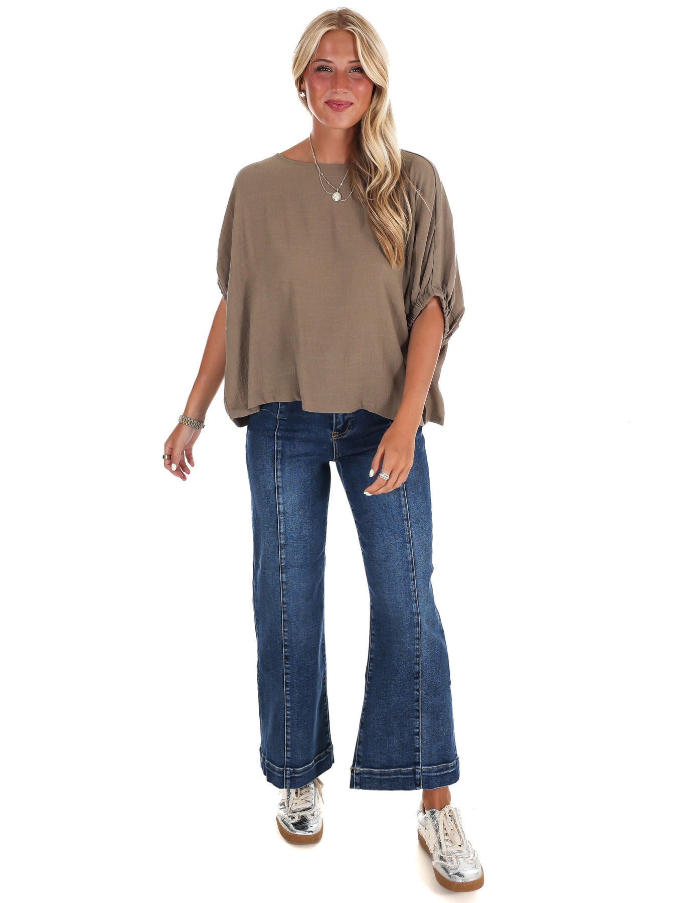 Embrace effortless style with the Road Less Traveled Top. This solid short sleeve blouse features a rounded neckline and elastic half sleeves that add a distinctive touch. Its loose, boxy fit ensures comfort and versatility, making it perfect for pairing with jeans and boots for a casual look or dressing up with a maxi skirt and sandals. Elevate your wardrobe with a top that adapts to your mood and occasion.